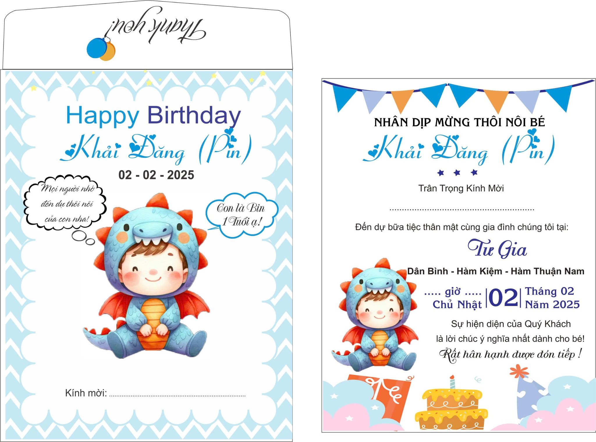 Thiệp thôi nôi "Dấu Ấn Rồng Xanh" từ Thiệp Cưới Đồng Xoài mang đến một phong cách tươi vui và ý nghĩa, đánh dấu cột mốc một tuổi của bé yêu. Thiết kế lấy cảm hứng từ hình ảnh bé rồng con đáng yêu, tượng trưng cho sự mạnh mẽ, may mắn và khởi đầu mới đầy hứa hẹn. Tông màu xanh dương chủ đạo kết hợp với họa tiết mây trắng và ngôi sao vàng nhẹ nhàng, tạo nên một tổng thể hài hòa, dịu mắt và tràn đầy tình yêu thương. Mẫu thiệp này không chỉ là lời mời mà còn là kỷ vật đầu tiên trong hành trình lớn khôn của con.