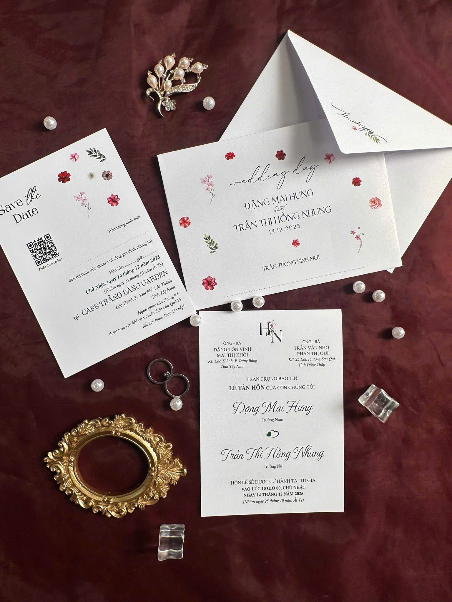 Flora Elegance là mẫu thiệp được ưa chuộng tại Thiệp Cưới Đồng Xoài nhờ sự kết hợp hoàn hảo giữa nét hiện đại và tinh thần tối giản châu Âu. Tông trắng chủ đạo phối cùng họa tiết hoa đỏ nhạt và lá xanh dịu mang đến cảm giác nhẹ nhàng, trang nhã và gần gũi.