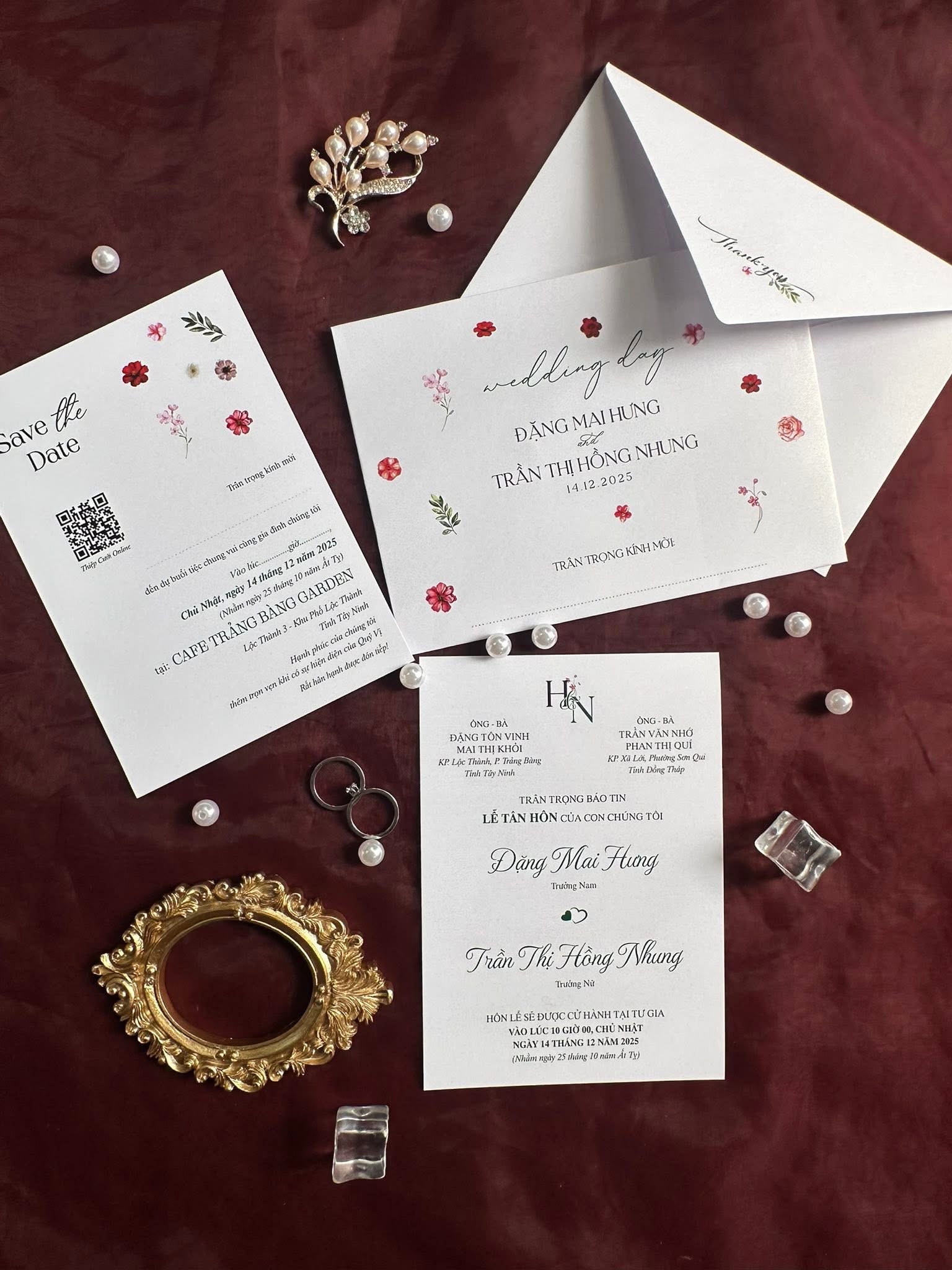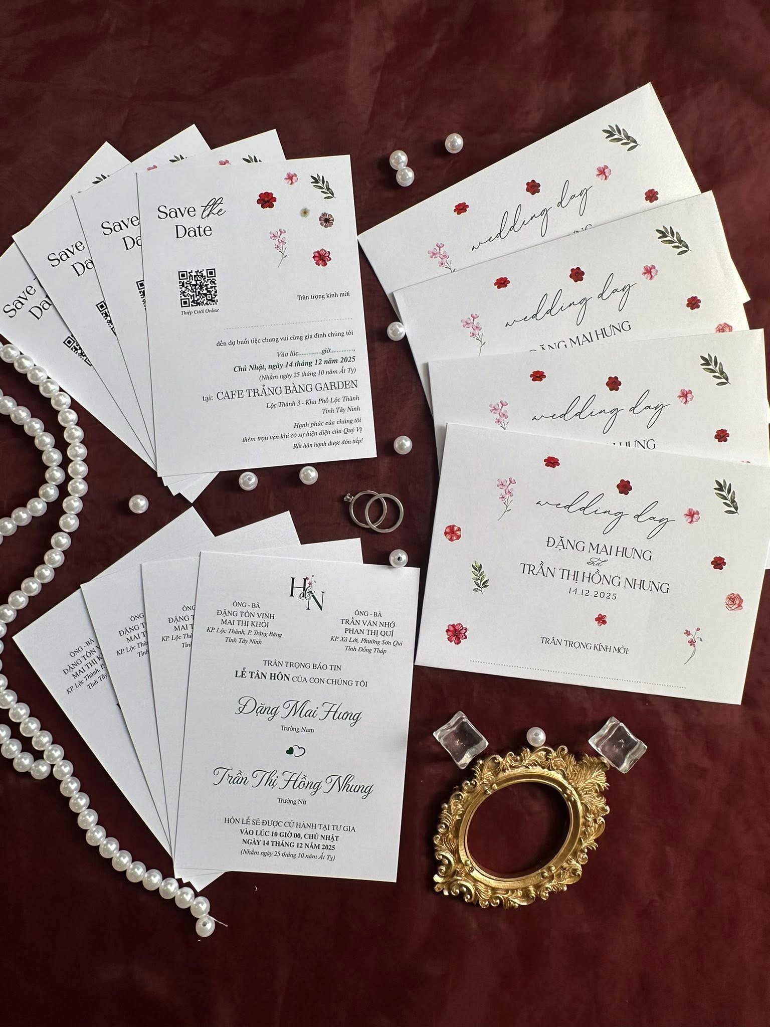 Mẫu thiệp “Spring Blossom” nổi bật với thiết kế tối giản, tinh tế, lấy cảm hứng từ hoa xuân – biểu tượng cho sự khởi đầu hạnh phúc. Tông trắng chủ đạo kết hợp chi tiết hoa in nổi màu đỏ nhẹ mang lại cảm giác nhẹ nhàng, hiện đại và sang trọng.
