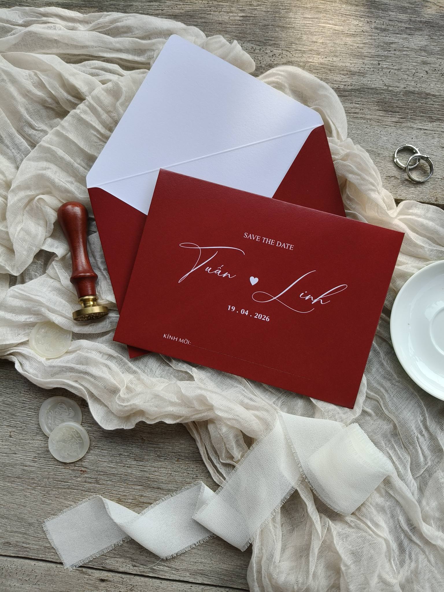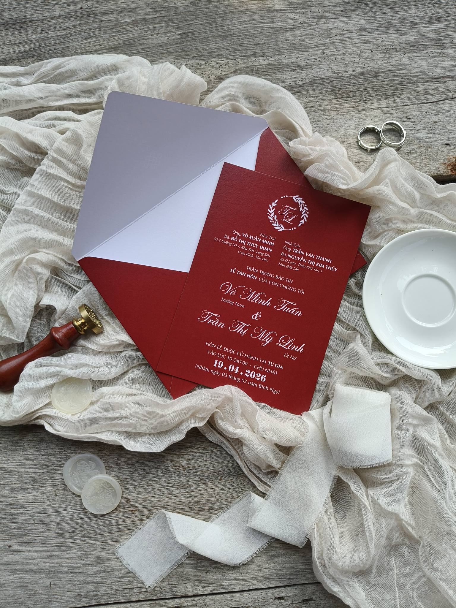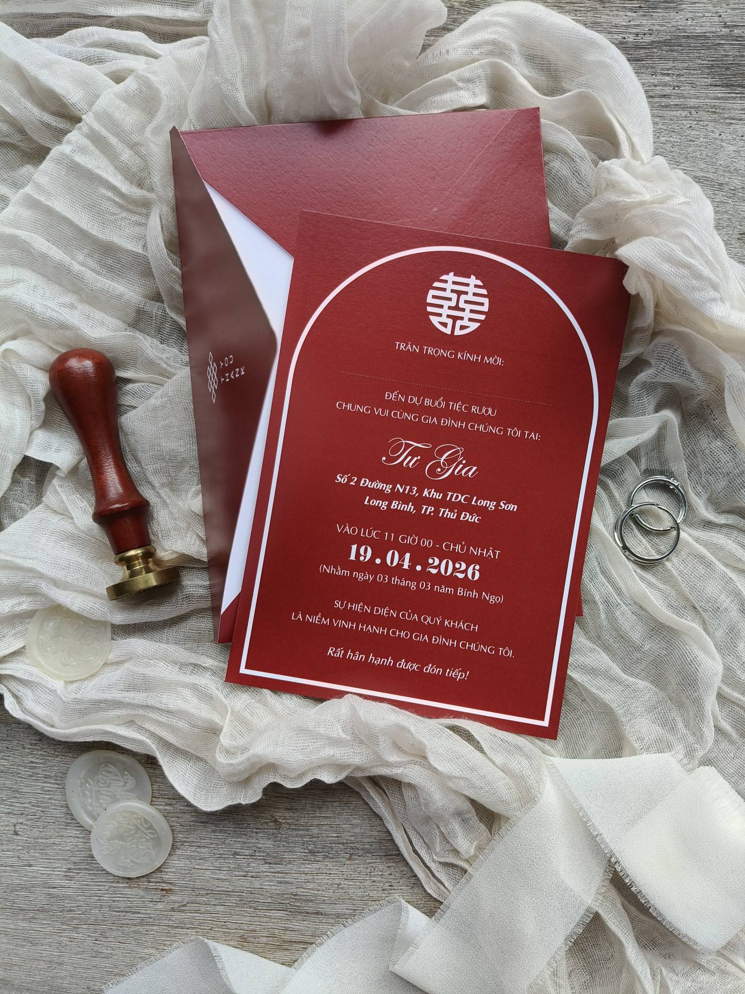 Thiệp nổi bật với tông màu đỏ huyết dụ chủ đạo, tượng trưng cho tình yêu nồng cháy và sự may mắn. Sự kết hợp tinh tế giữa phông chữ viết tay mềm mại cho tên cô dâu chú rể và phông chữ cổ điển rõ ràng cho nội dung tạo nên tổng thể hài hòa giữa hiện đại và truyền thống. Họa tiết được tiết chế vừa đủ, giúp tấm thiệp giữ được nét sang trọng và tinh gọn, đồng thời tôn lên gu thẩm mỹ tinh tế của gia chủ. Đây không chỉ là một lời mời mà còn là kỷ vật lưu giữ dấu ấn ngày trọng đại.