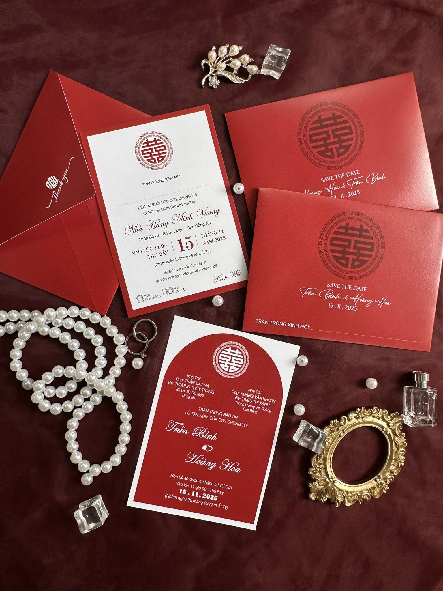 Bố cục cân đối, trang nhã, từ bao thư đến thiệp mời đều được thiết kế đồng bộ, tạo nên một tổng thể hài hòa và chuyên nghiệp.