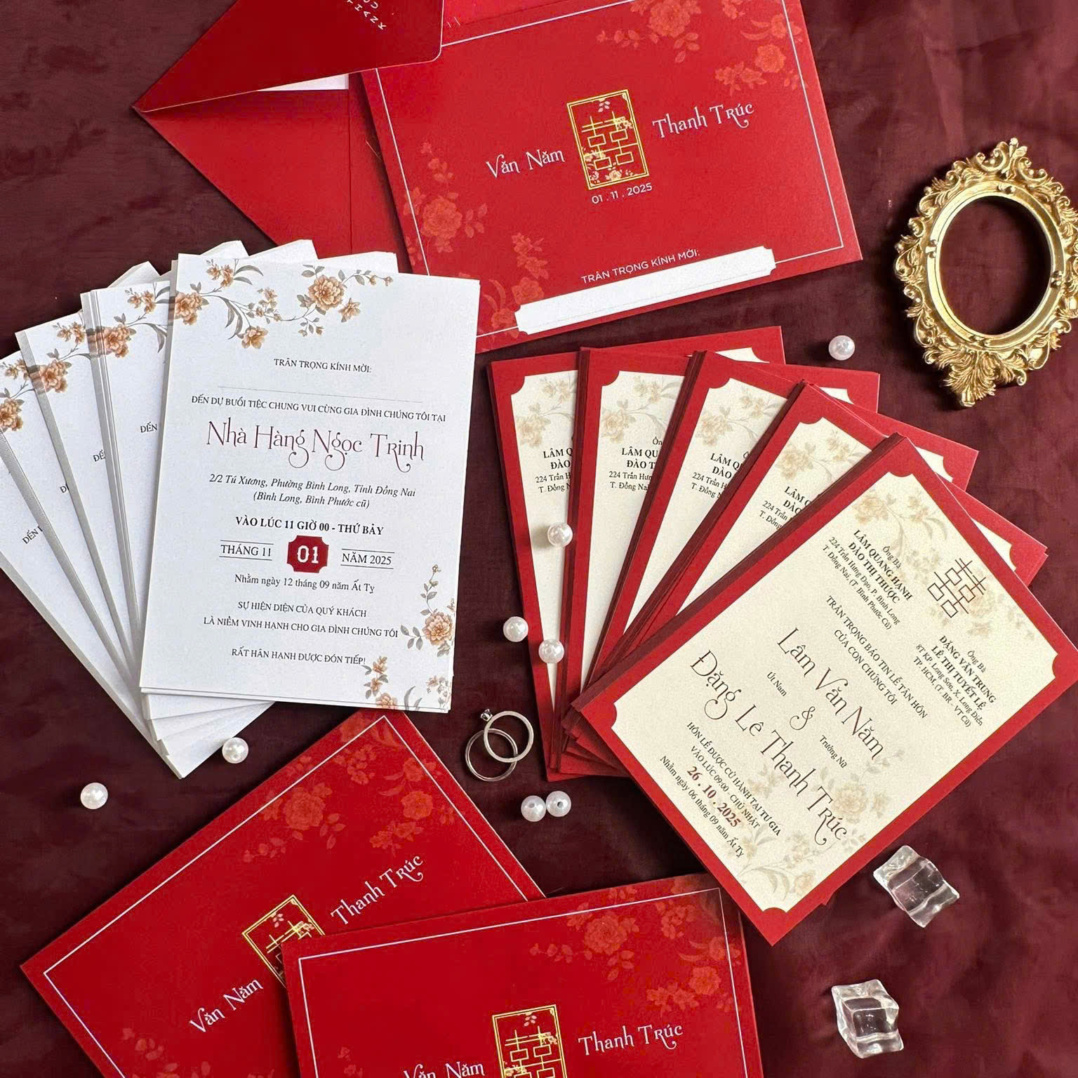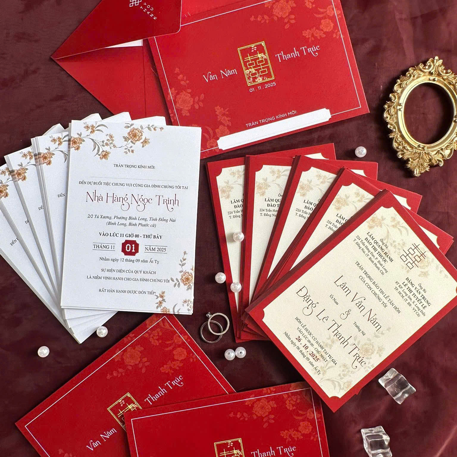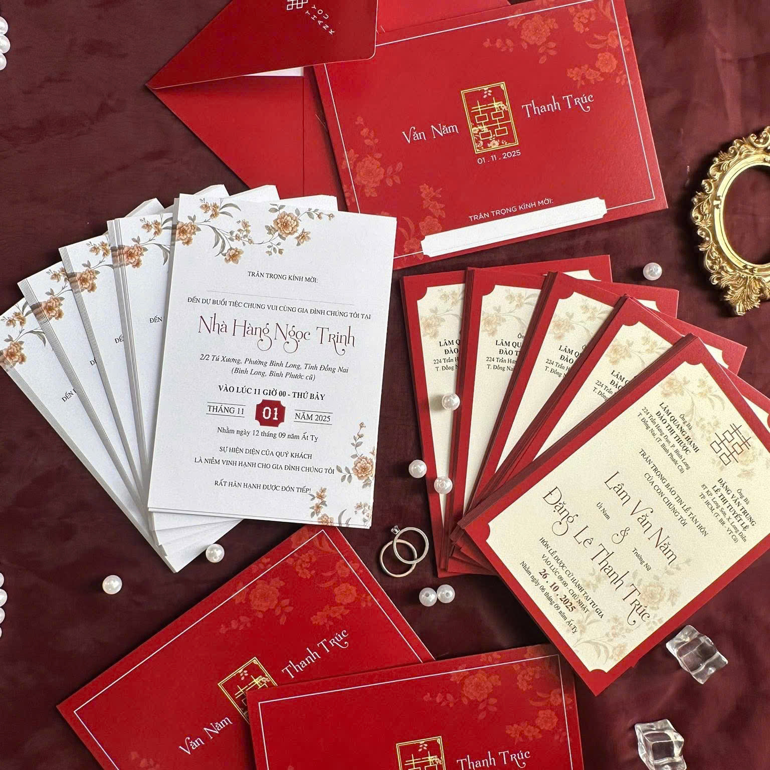 Sắc đỏ truyền thống: Tông màu đỏ chủ đạo, biểu tượng của tình yêu nồng cháy, may mắn và thịnh vượng trong văn hóa Á Đông.