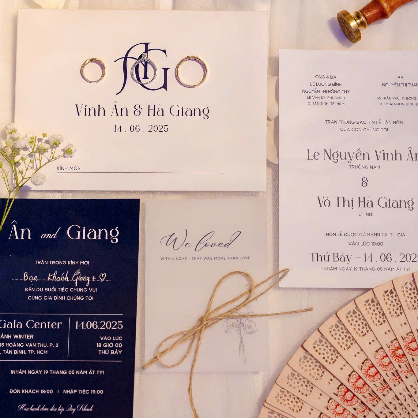 - THIỆP CƯỚI "DẤU ẤN TÌNH YÊU VĨNH CỬU" – KHẮC GHI HẠNH PHÚC ĐÔI LỨA Thiệp cưới "Dấu Ấn Tình Yêu Vĩnh Cửu" mang phong cách tối giản, tinh tế với gam màu trắng kem chủ đạo và điểm nhấn xanh navy, là lựa chọn hoàn hảo cho cặp đôi yêu thích vẻ đẹp thanh lịch và biểu tượng vĩnh cửu của tình yêu.