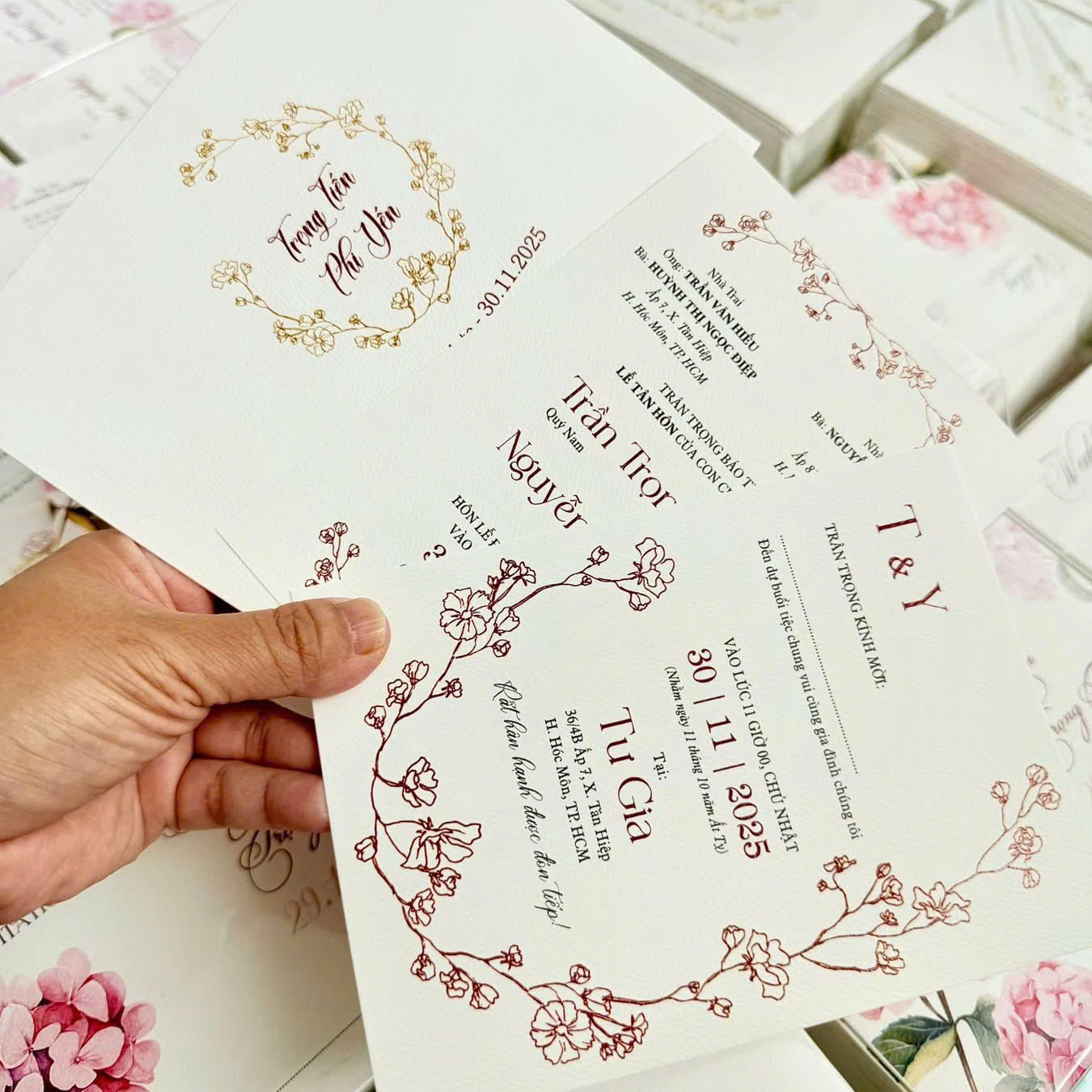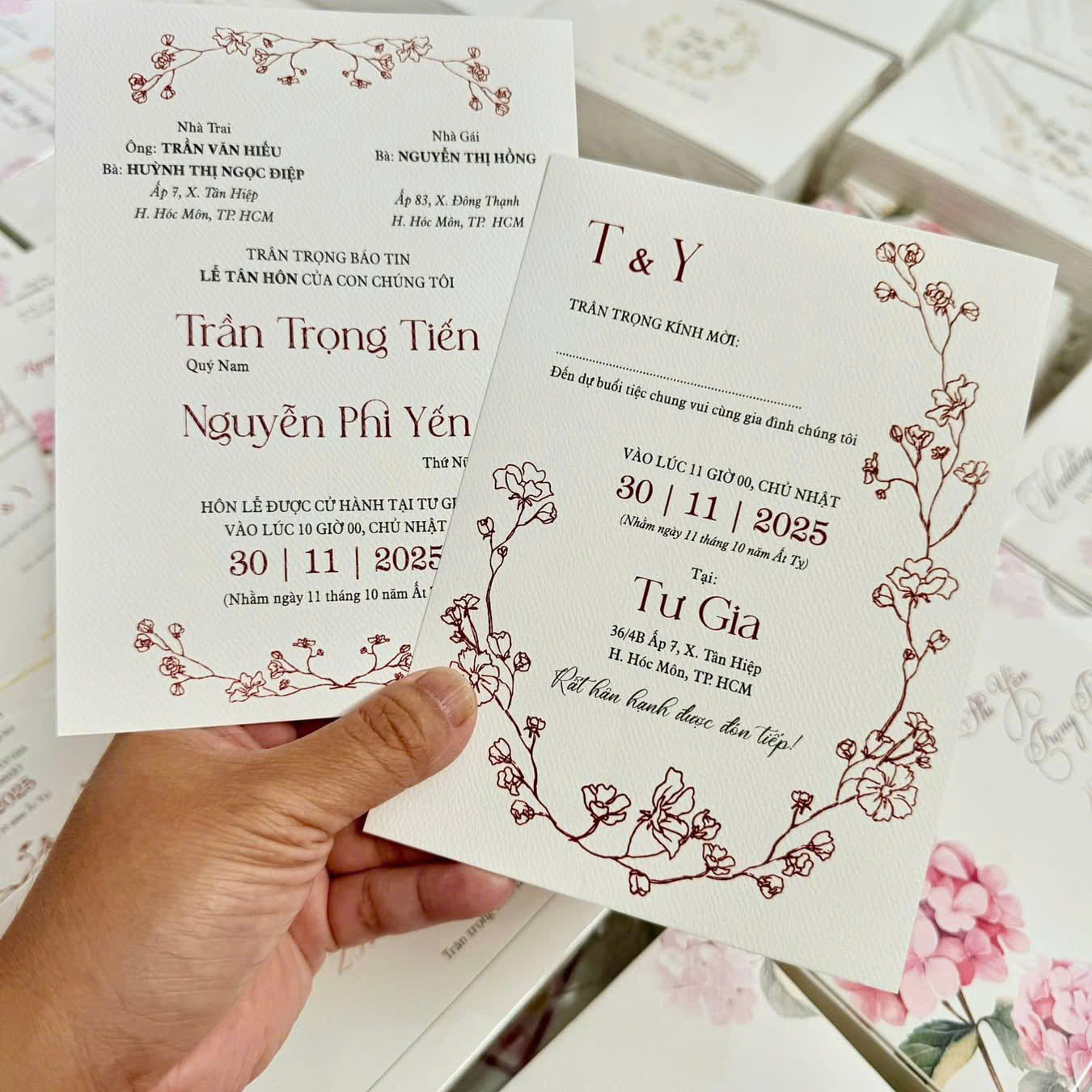 * Hỗ trợ in bù thiệp với số lượng ít, giá không đổi: Giải quyết nỗi lo phát sinh khách mời hoặc sai sót nhỏ, đảm bảo không gián đoạn kế hoạch của bạn.