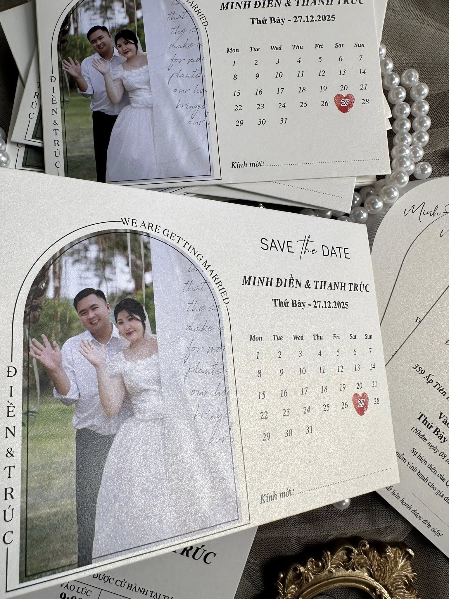 Thiệp “Save the Date” được điểm xuyết bằng khung ảnh đôi, tạo dấu ấn riêng cho cặp uyên ương. Kiểu chữ serif kết hợp handwritten nhẹ nhàng gợi nét cổ điển tinh tế, phù hợp xu hướng cưới thanh lịch của năm 2025.