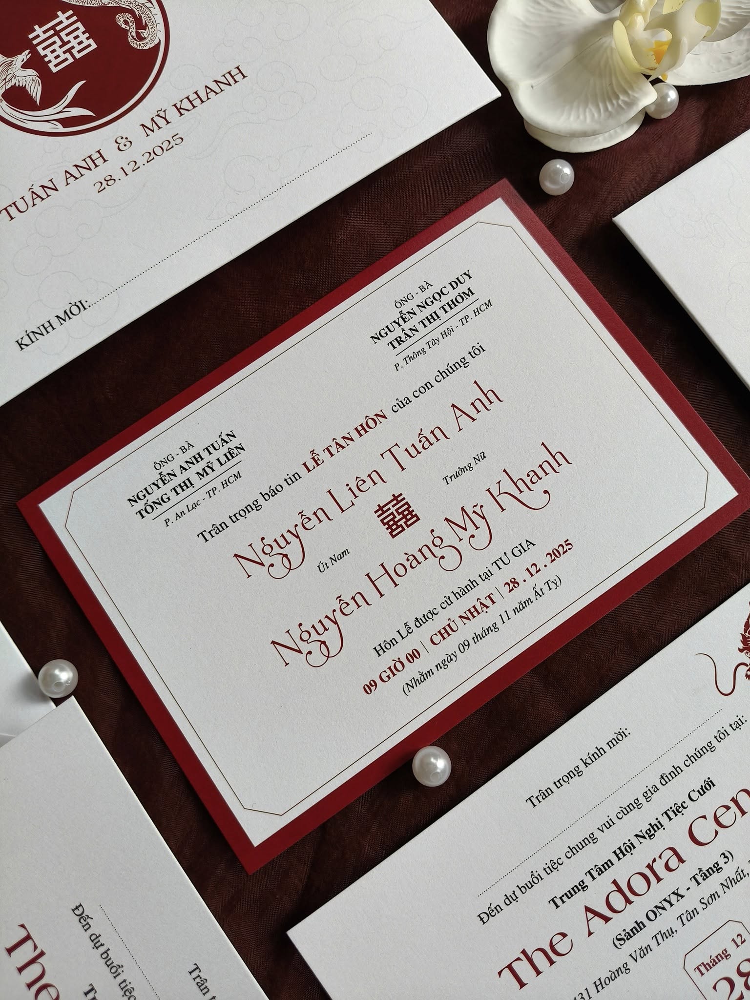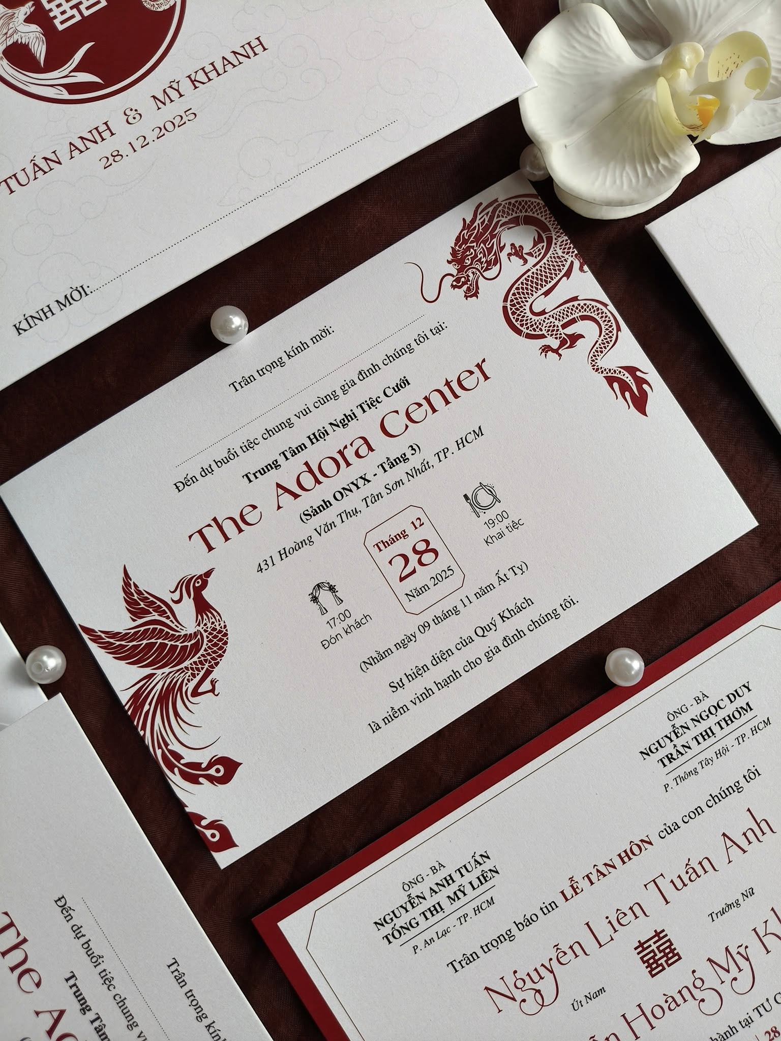 - Thiệp cưới Song Hỷ Long Phụng là lựa chọn hoàn hảo cho những cặp đôi yêu thích sự kết hợp giữa văn hóa truyền thống và vẻ đẹp hiện đại, với tông màu đỏ chủ đạo cùng họa tiết tinh xảo, mang ý nghĩa về một hôn nhân thịnh vượng và hạnh phúc.