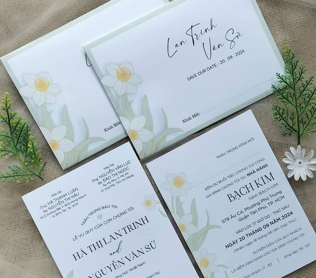 Thiệp Cưới Hoa Thủy Tiên Thanh Lịch là biểu tượng của sự thuần khiết và khởi đầu mới, thể hiện qua họa tiết hoa thủy tiên trắng vàng dịu dàng trên nền thiệp trắng thanh khiết. Thiết kế này được điểm xuyết bởi viền xanh mint nhẹ nhàng, tạo cảm giác thư thái và tươi mới, gợi nhắc về sự lãng mạn của mùa xuân.