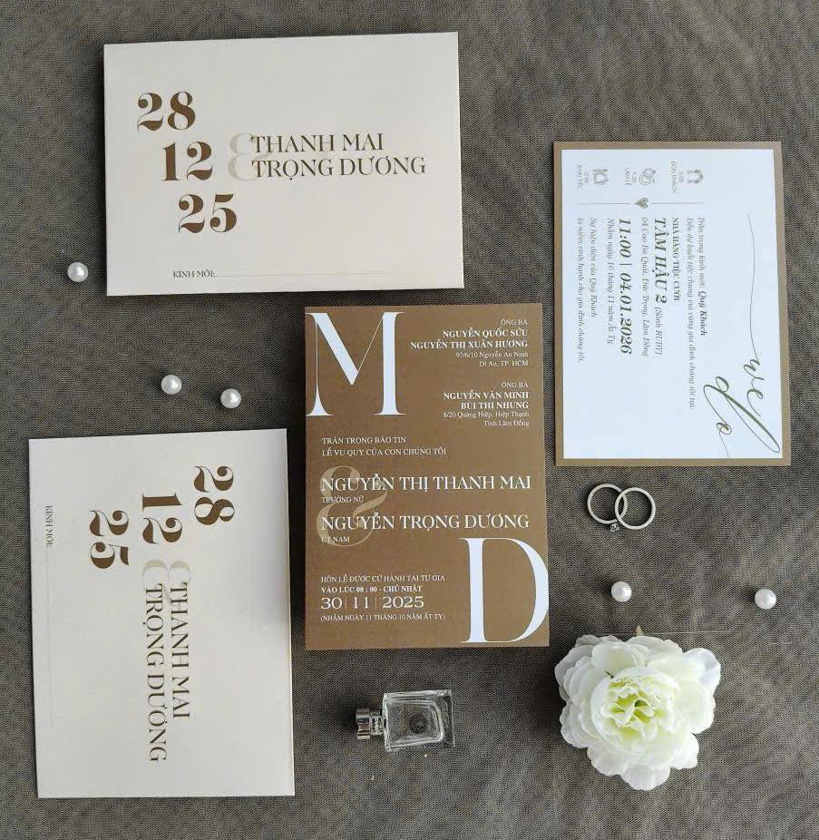 Kiểu chữ đa dạng: Sự kết hợp giữa font chữ cổ điển và hiện đại, làm nổi bật các thông tin quan trọng như ngày tháng và tên cô dâu chú rể, tạo nên phong cách độc đáo.