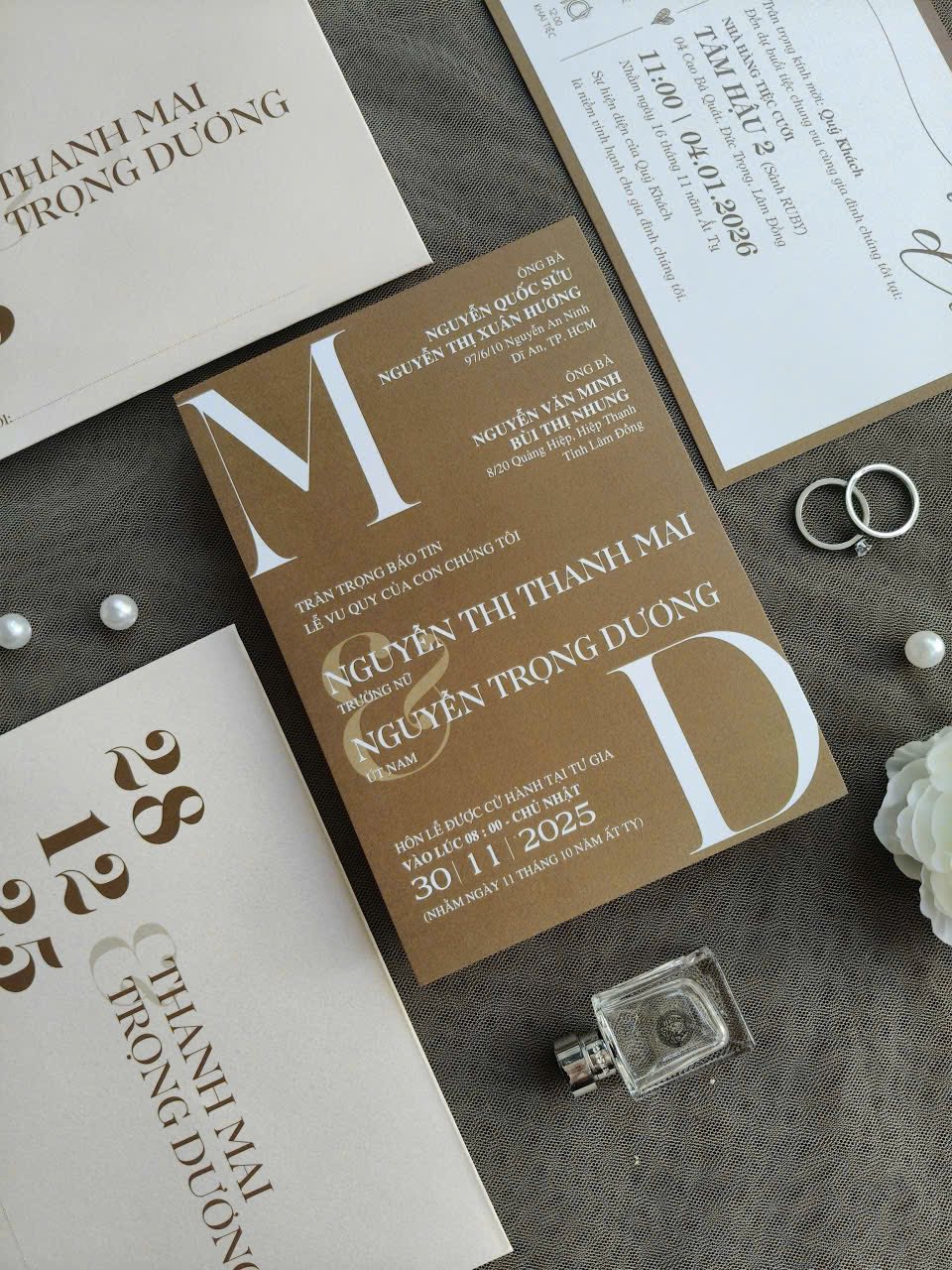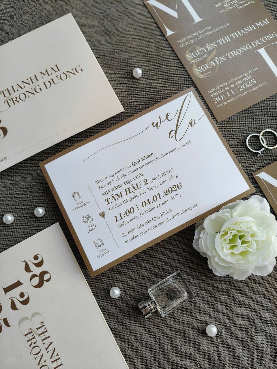 - THIỆP CƯỚI ELEGANT TAUPE – SẮC MÀU TINH TẾ CHO HẠNH PHÚC VẸN TRÒN Thiệp Cưới Elegant Taupe là lựa chọn hoàn hảo cho những cặp đôi tìm kiếm sự sang trọng, tinh tế và vượt thời gian. Với tông màu trung tính ấm áp kết hợp giữa kem và nâu vàng, mẫu thiệp này mang đến vẻ đẹp thanh lịch, cổ điển nhưng vẫn đầy hiện đại. Đây là lời mời cưới trang trọng, khởi đầu cho một hành trình hạnh phúc vẹn toàn.