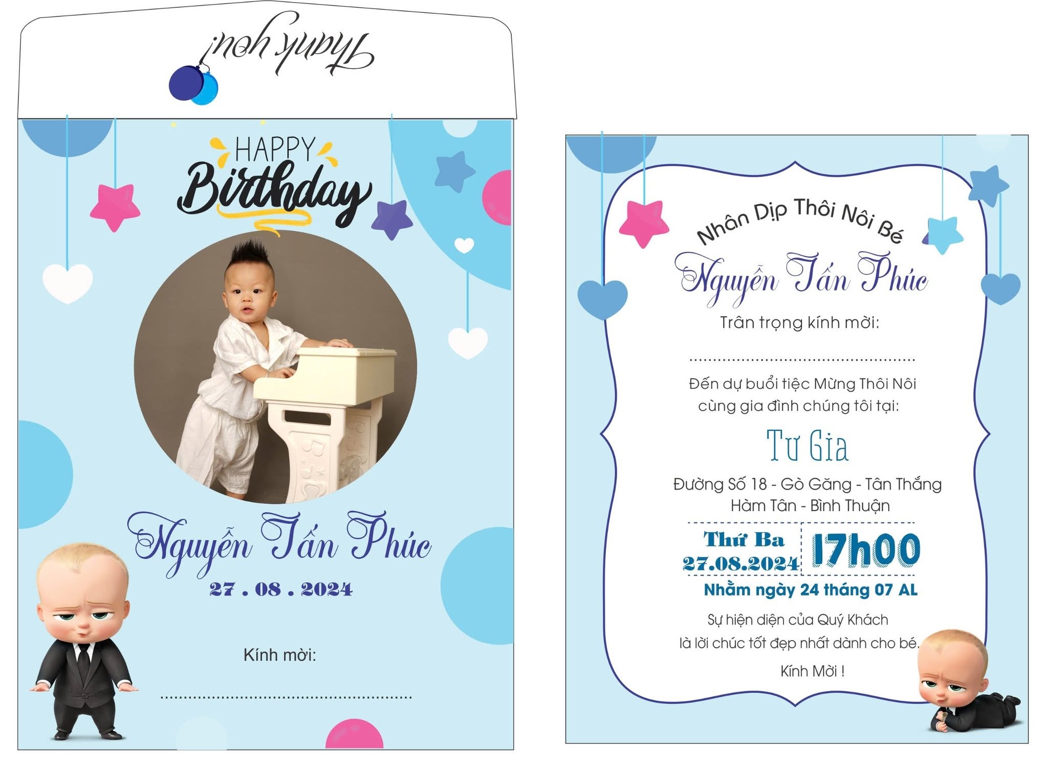 - THIỆP THÔI NÔI LITTLE GENTLEMAN'S CELEBRATION – KHỞI ĐẦU CUỘC ĐỜI ĐẦY YÊU THƯƠNG Thiệp thôi nôi Little Gentleman's Celebration là lựa chọn hoàn hảo để ghi dấu ngày đầu tiên bé yêu bước vào đời. Với thiết kế tinh tế, tông màu xanh pastel dịu mát và hình ảnh ngộ nghĩnh, mẫu thiệp này sẽ mang đến sự sang trọng và ấm áp cho buổi tiệc của bạn.