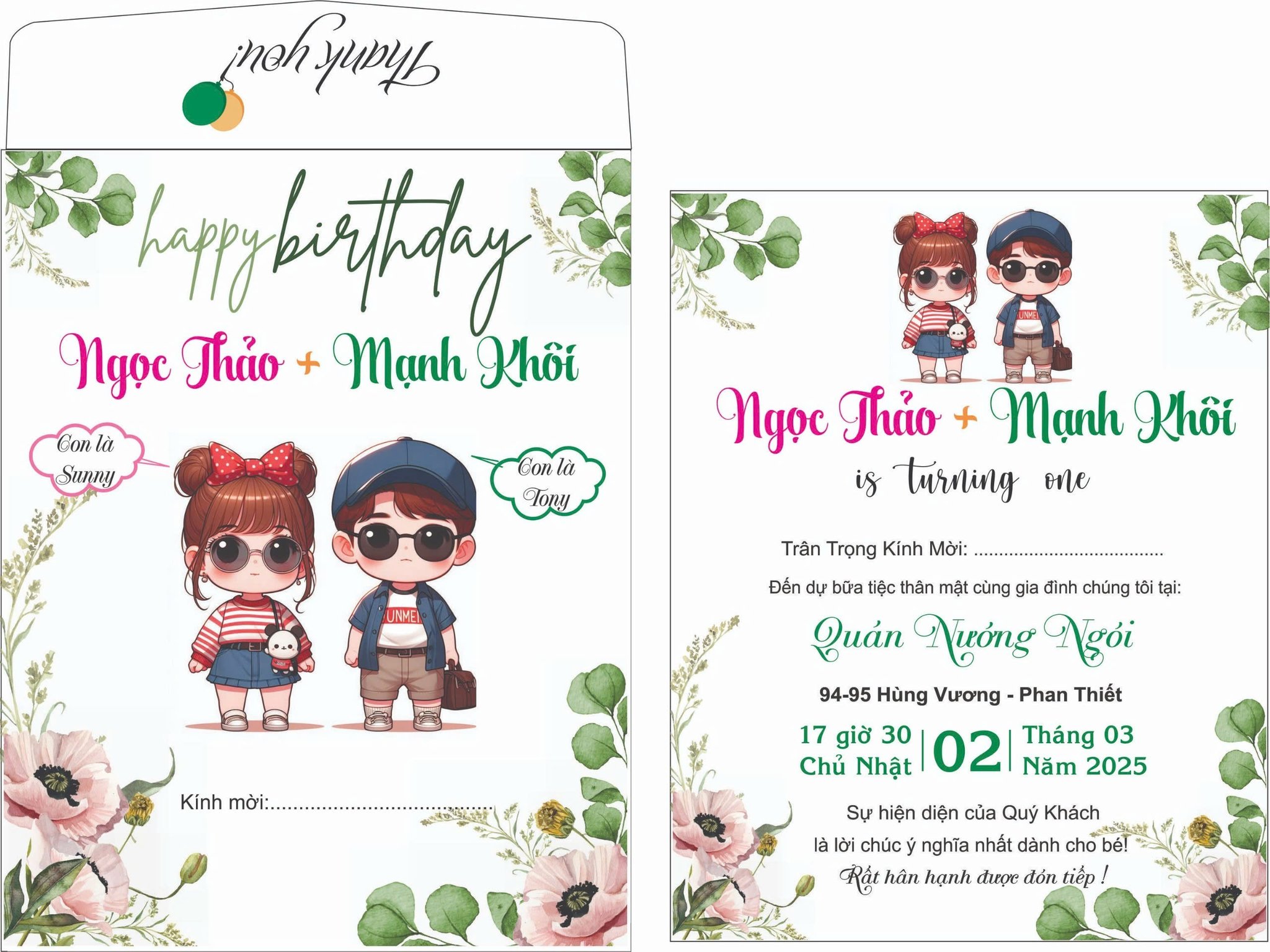 Thiết kế này nổi bật với hình ảnh minh họa cặp đôi chibi bé trai và bé gái, tạo nên sự gần gũi và thân thiện. Tông màu hồng pastel nhẹ nhàng kết hợp với xanh lá tươi mát của họa tiết hoa và lá cây, mang đến cảm giác thanh bình, trong trẻo. Bố cục thiệp được sắp xếp cân đối, hài hòa, giúp thông tin về buổi tiệc được truyền tải một cách rõ ràng và trang nhã. Font chữ mềm mại, hiện đại làm nổi bật tên của bé và thông điệp mời gọi.