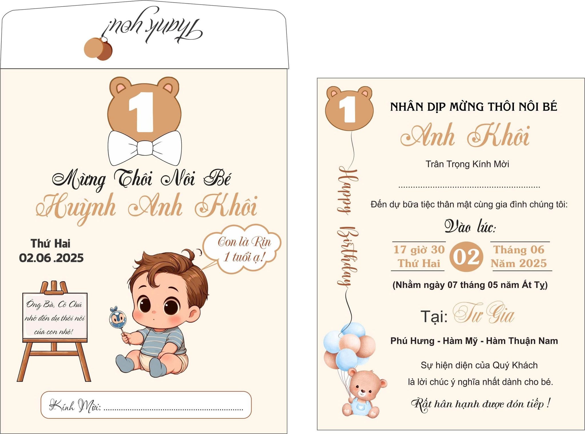 Thiệp Thôi Nôi Gấu Yêu Dịu Dàng là biểu tượng của sự đáng yêu và tinh tế, được thiết kế đặc biệt để chào mừng sinh nhật đầu tiên của các bé. Với tông màu chủ đạo là kem, xanh pastel và nâu đất, mẫu thiệp này tạo nên một không gian ấm cúng, thân mật, phản ánh niềm hạnh phúc vô bờ bến của gia đình trong ngày trọng đại.