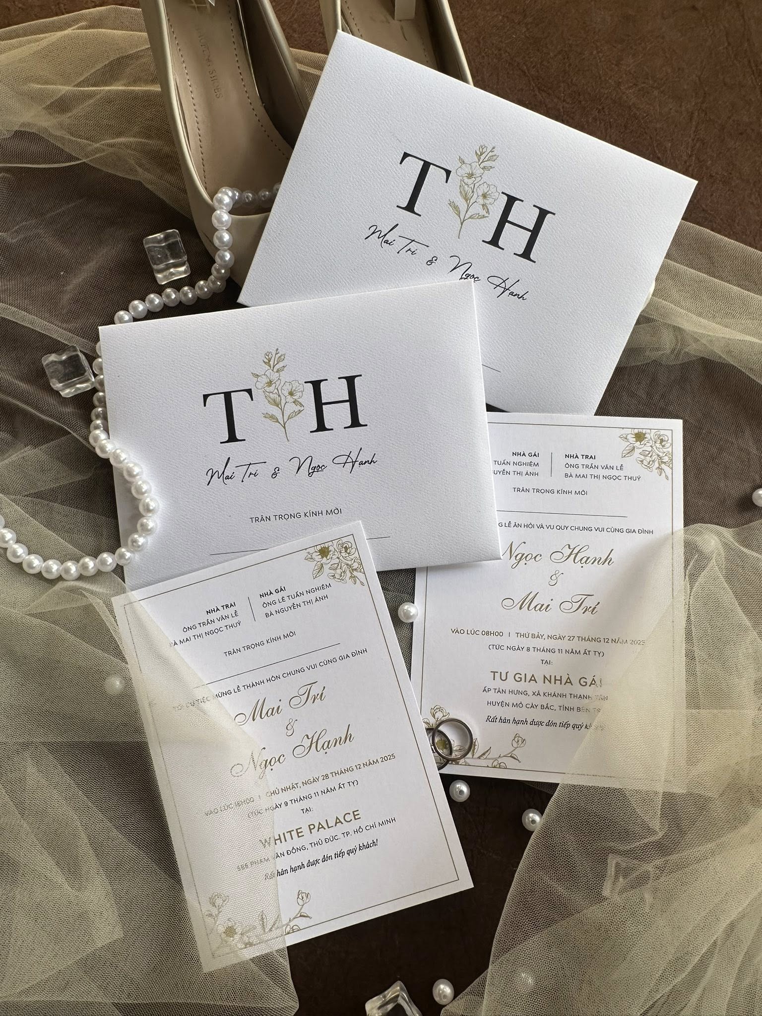 - Thiệp cưới Monogram Hoa Lá Tinh Khiết mang phong cách cổ điển, sang trọng với thiết kế monogram lồng ghép tinh xảo và họa tiết hoa lá vàng ánh kim thanh nhã, là lựa chọn lý tưởng cho cặp đôi yêu thích vẻ đẹp vượt thời gian.